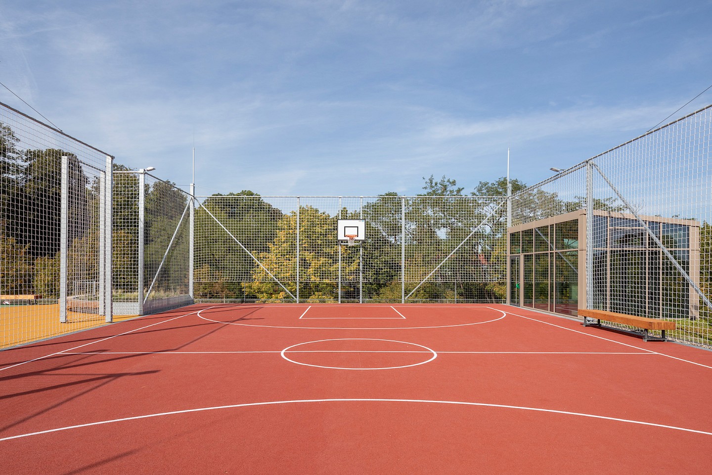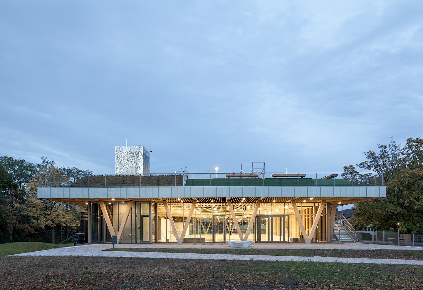 Innovatives Holzbauprojekt mit einer einzigartigen Dachkonstruktion, die als Sport- und Spielfläche dient.